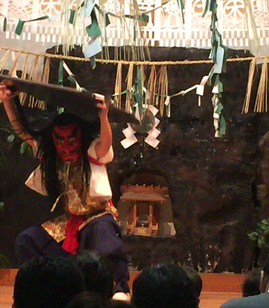 天の岩戸を開けるために、天鈿女命が岩戸の前で舞い、何の騒ぎかとチラッと天照大神が岩戸をチラッと開けた時に天手力男命が岩戸を開けて天照大神がお出ましになる、という神話の神楽でした