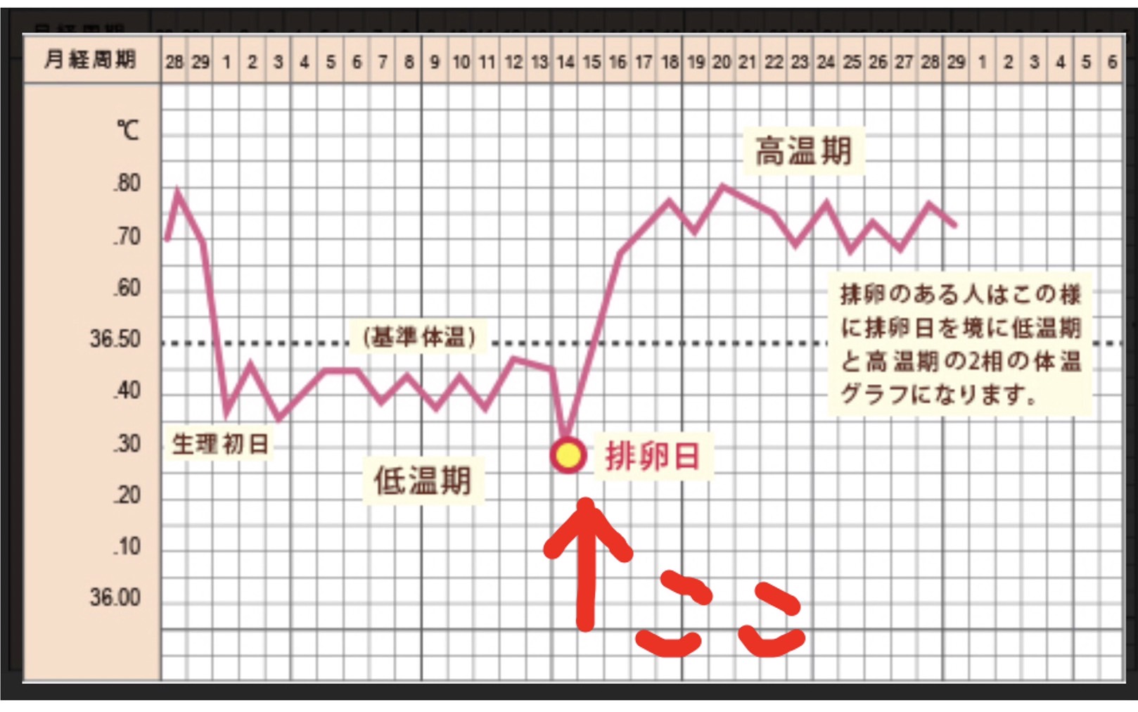 「この基礎体温のグラフが定番で良く出回っていますが、排卵日に体温が下がる、って言うのは根拠がありません」と言っていました。私もそれを聞いて「そうだったのか~!」と納得したのでした。