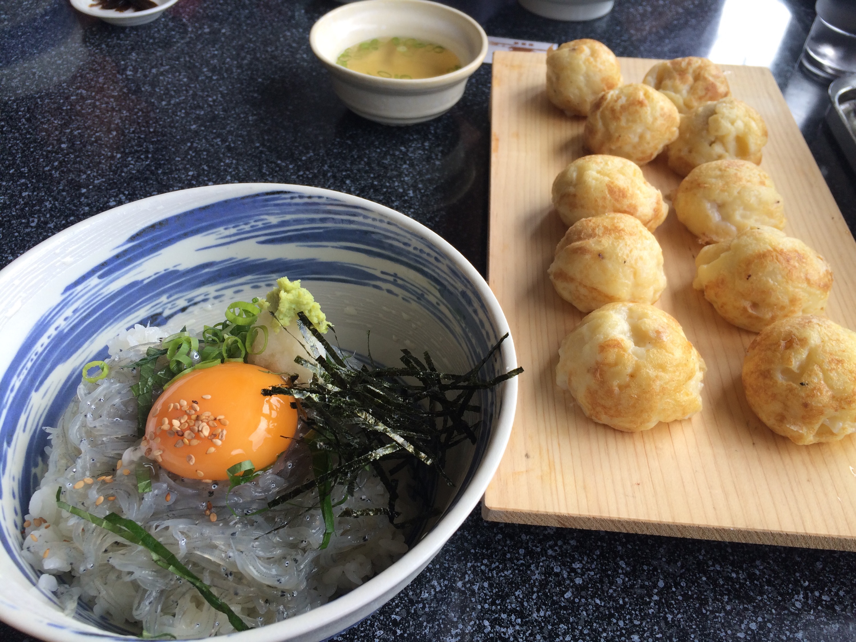 近くの港で、生しらす丼と明石焼きと玉ねぎのてんぷらを頂きました