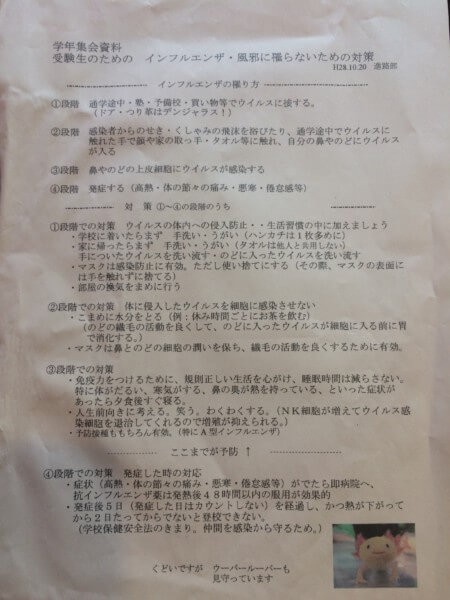 「受験生のためのインフルエンザ・風邪に罹らないための対策」というのが配られました