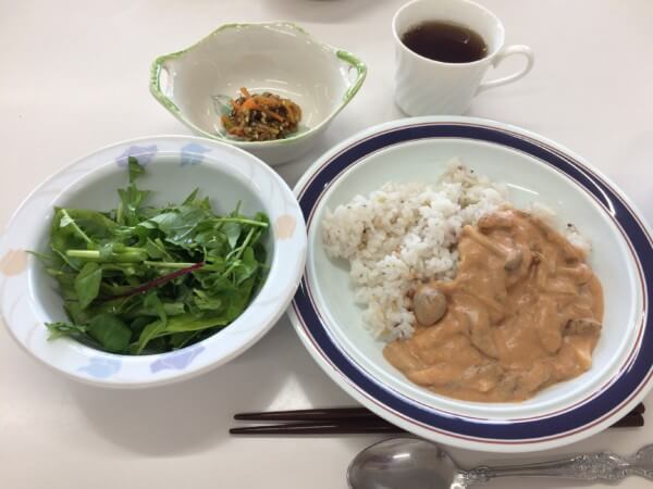- グルテンミートのビーフストロガノフ・バターライス添え